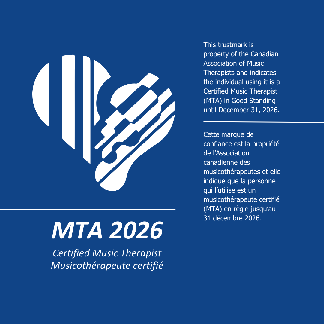 ET Music Therapy’s therapists are: Music Therapist Accredited (MTA) by the Canadian Association of Music Therapy, and/or Music Therapist Board Certified (MT-BC) by the Certification Board for Music Therapists (CBMT)